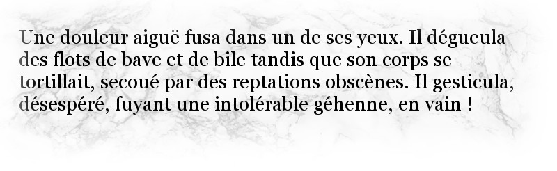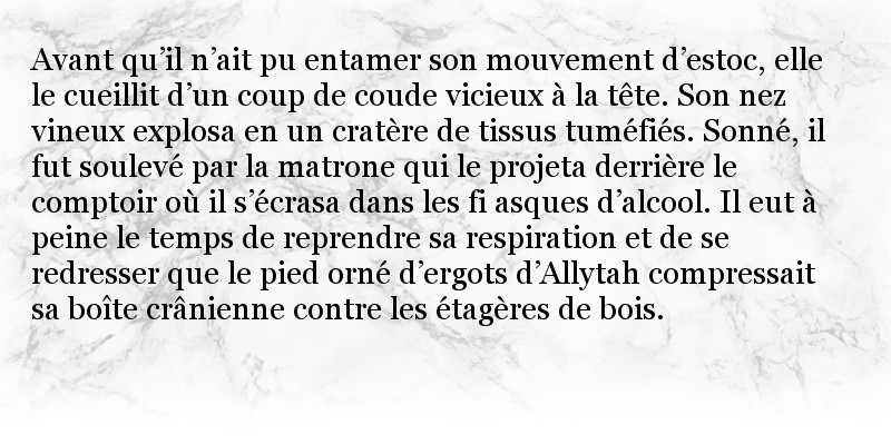 Avec des sursauts d’humour noir toujours bien venus, l’auteur nous offre un univers rude et sa galerie de trognes abjectes, fond glauque sur lequel se détache la figure de la véritable héroïne de ce premier tome, la bestiale, pugnace et pourtant, trait de génie, attachante Allytah. La grande Histoire du royaume s’imbrique dans la quête principale de cette dernière, permettant au lecteur de découvrir le monde de Yelgor, au travers des retours en arrière et des dialogues acérés, ciselés jusqu’à la pointe. La justesse quasi absolue du vocabulaire vous permet de voir et de ressentir chaque péripétie, et ce n’est pas vraiment une promenade de santé, plutôt un long sillon dans le champ lexical de la souffrance :